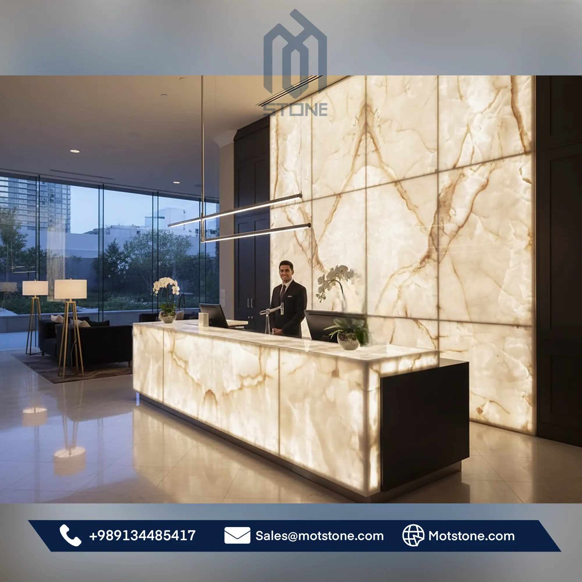 Yes. White onyx is one of the most suitable natural stones for backlit applications due to its natural translucency. When backlit, the stone highlights its veining and depth, making it ideal for feature walls, reception desks, and luxury interiors.